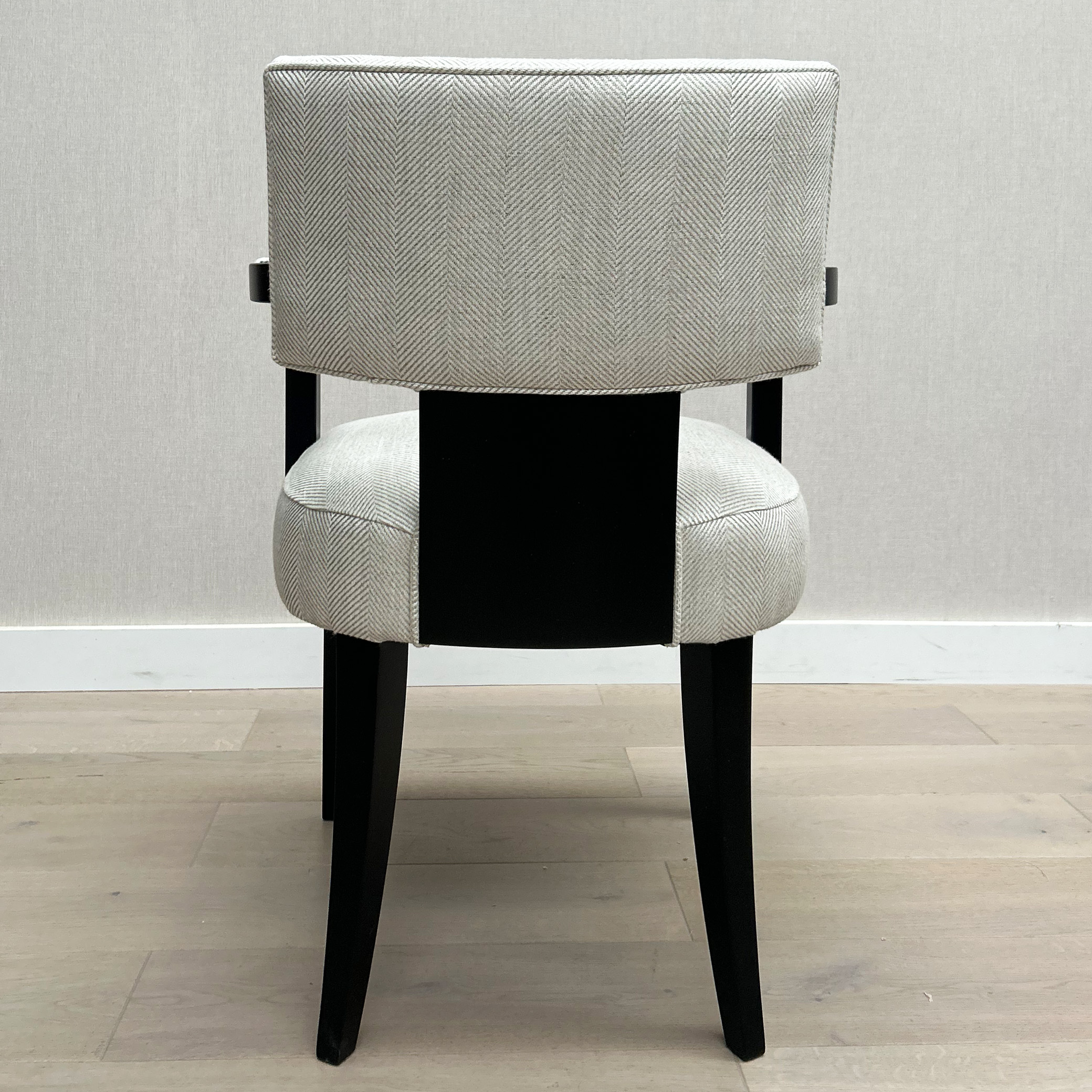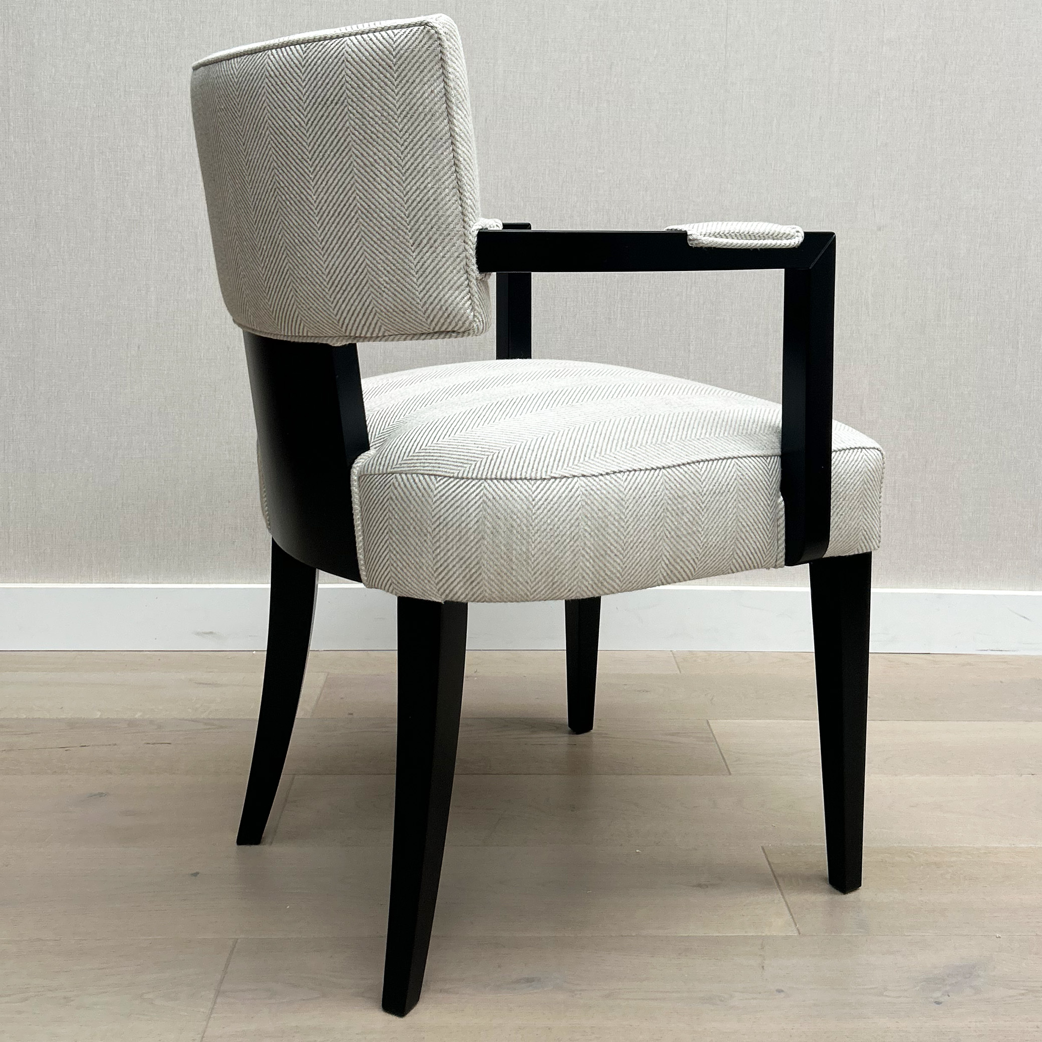 The Apollon is available as per seen in 2 x quantity. Apollon attracts with its modern accent chair with contemporary and subtle Art Deco influences, featuring an exposed structural frame, open arms, and a gently curved upholstered back. Its clean lines, tailored upholstery, and tapered legs give it a refined, architectural look suitable for modern or transitional interiors. The frame finish is Black Stained 20% Sheen Beechwood.