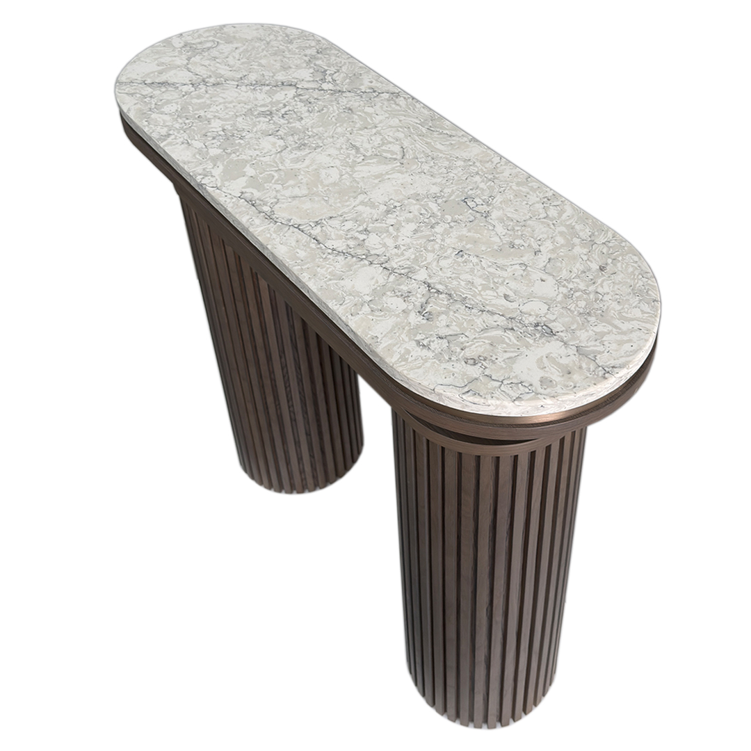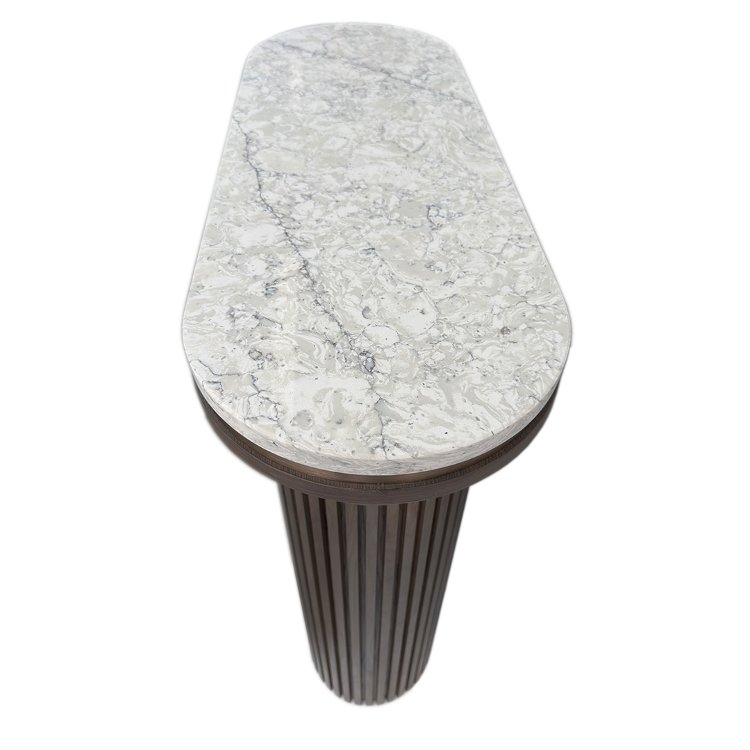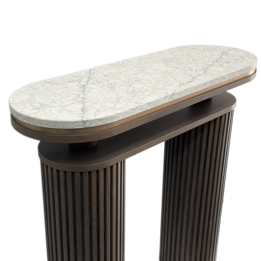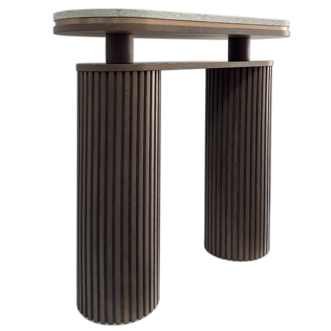 The Colosseum console table features a sleek, raised top supported by cylindrical, fluted pillars, creating a striking architectural look. A horizontal panel connects the bases, adding stability and structure with style through its brushed aluminium in-lay detail and marble top. With its clean lines, rounded edges, and bold textures, the Colosseum table balances modern sophistication with sculptural appeal—perfect for entryways or contemporary interiors.