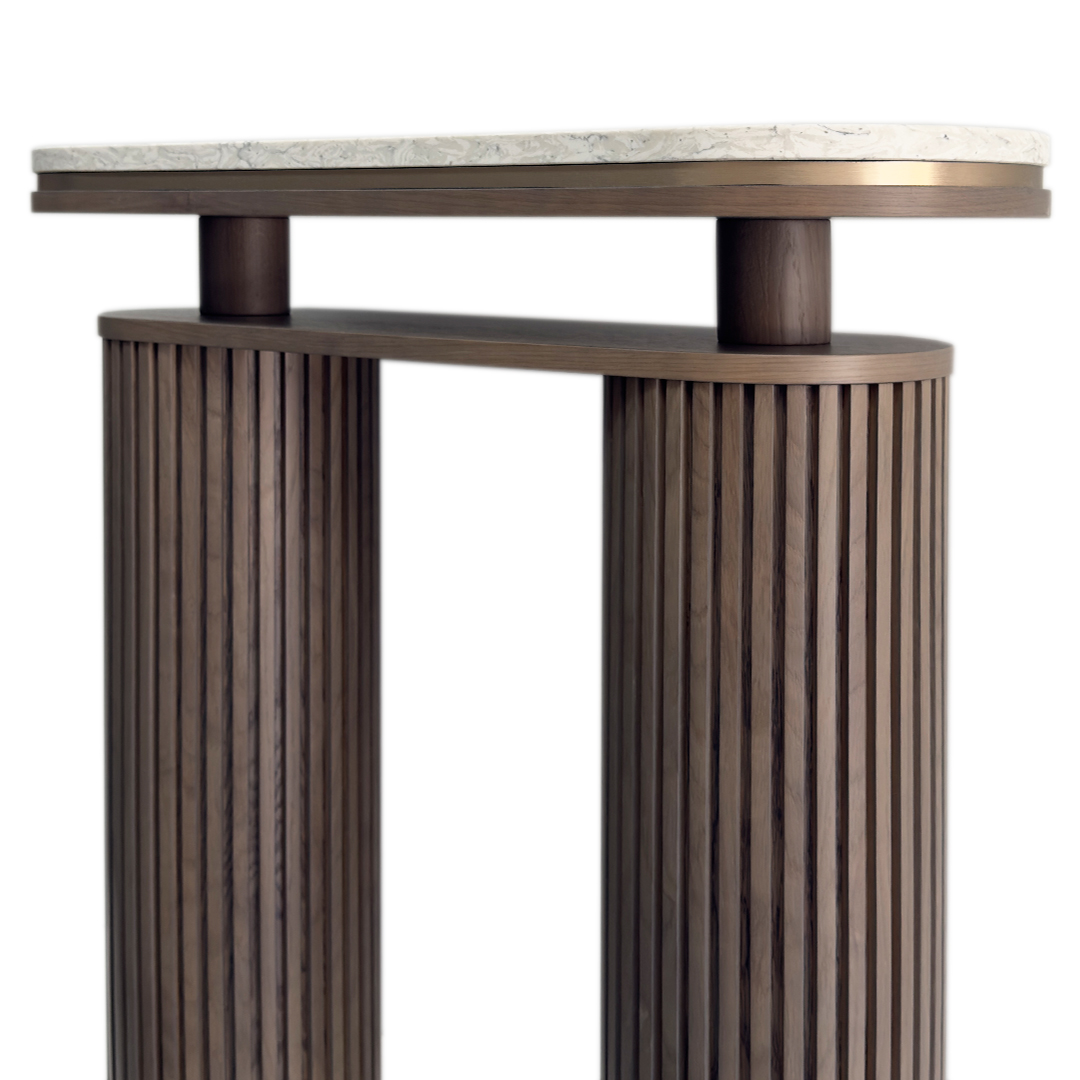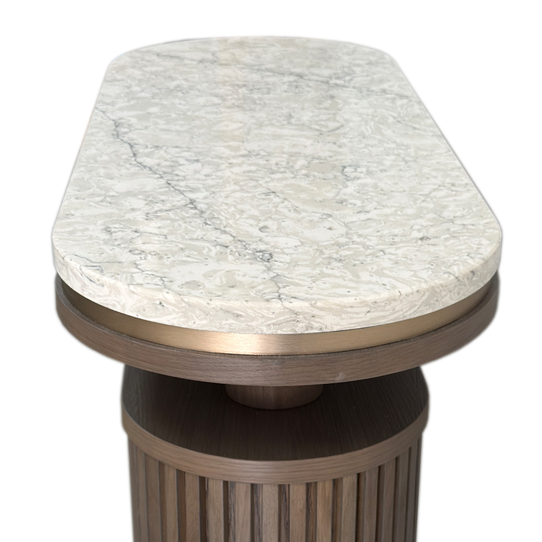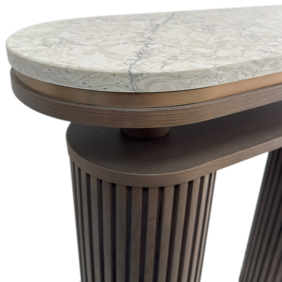 The Colosseum console table features a sleek, raised top supported by cylindrical, fluted pillars, creating a striking architectural look. A horizontal panel connects the bases, adding stability and structure with style through its brushed aluminium in-lay detail and marble top. With its clean lines, rounded edges, and bold textures, the Colosseum table balances modern sophistication with sculptural appeal—perfect for entryways or contemporary interiors.