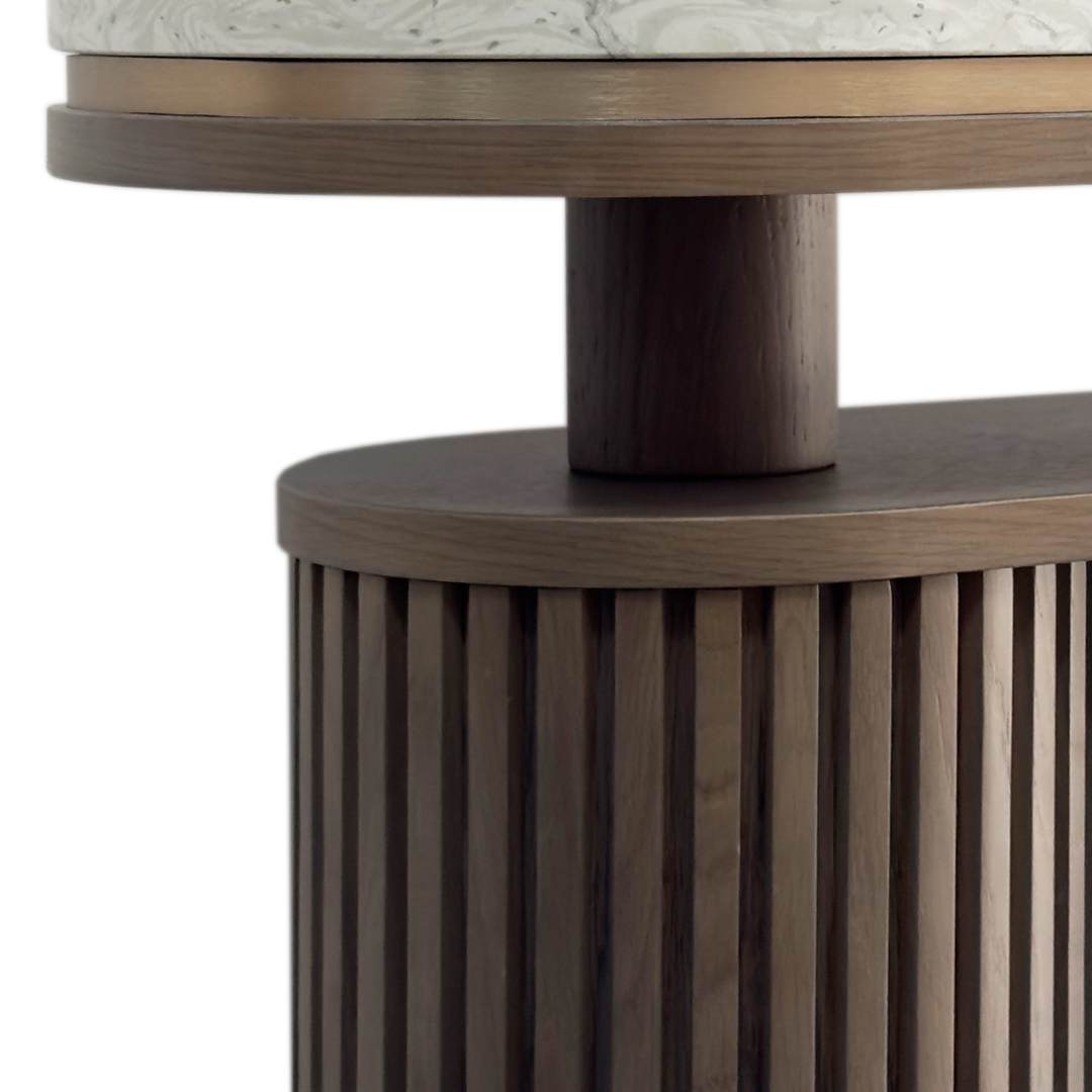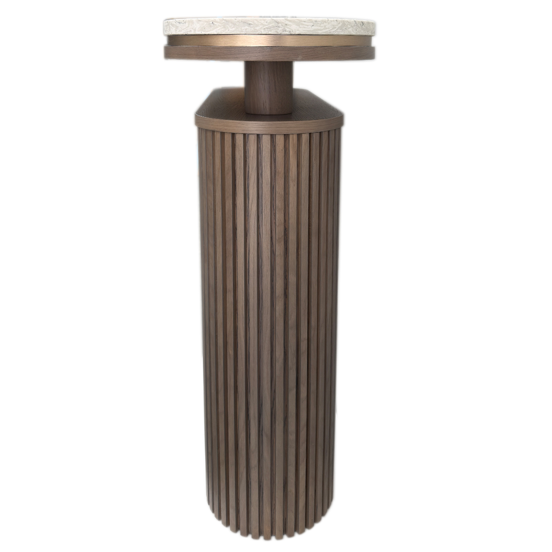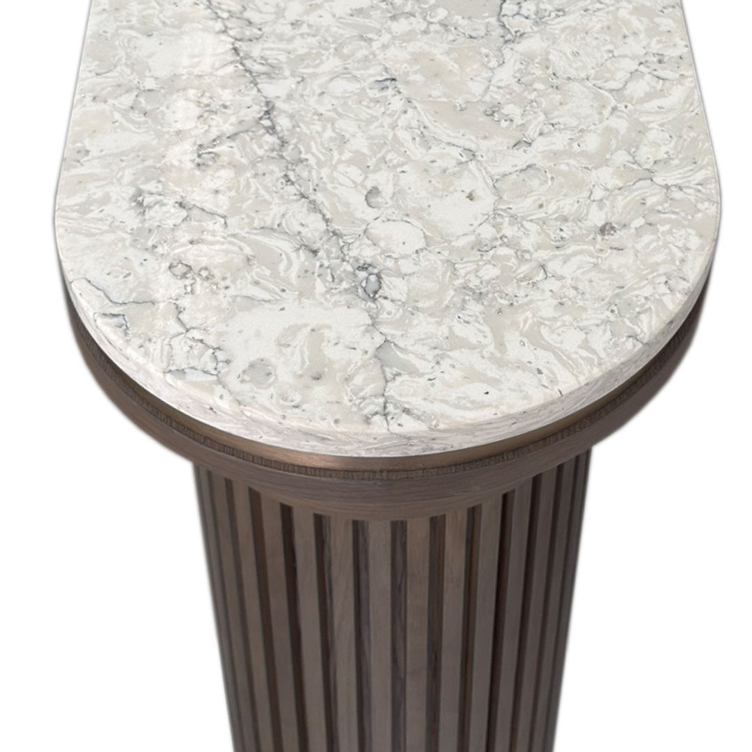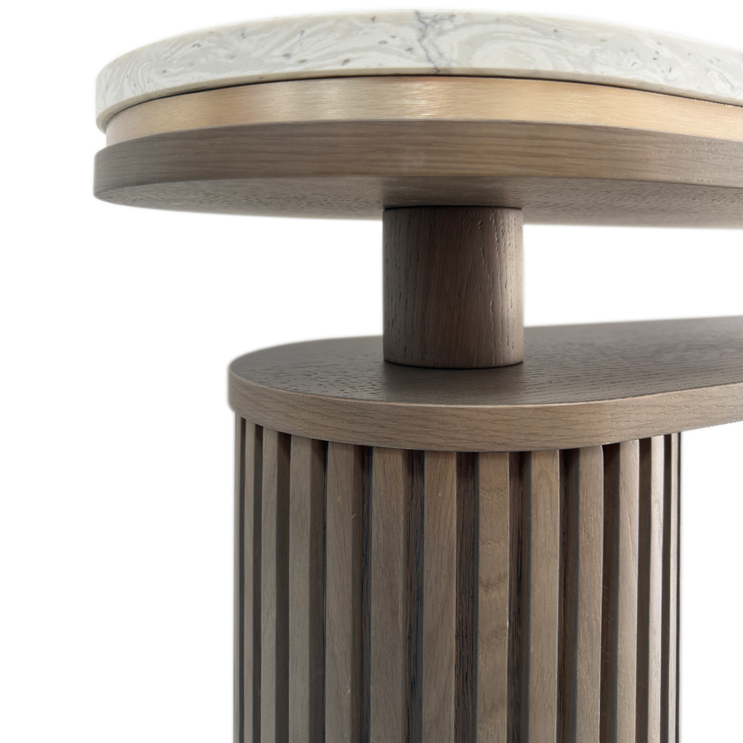 The Colosseum console table features a sleek, raised top supported by cylindrical, fluted pillars, creating a striking architectural look. A horizontal panel connects the bases, adding stability and structure with style through its brushed aluminium in-lay detail and marble top. With its clean lines, rounded edges, and bold textures, the Colosseum table balances modern sophistication with sculptural appeal—perfect for entryways or contemporary interiors.