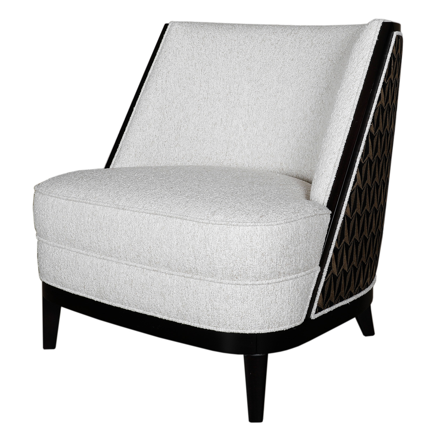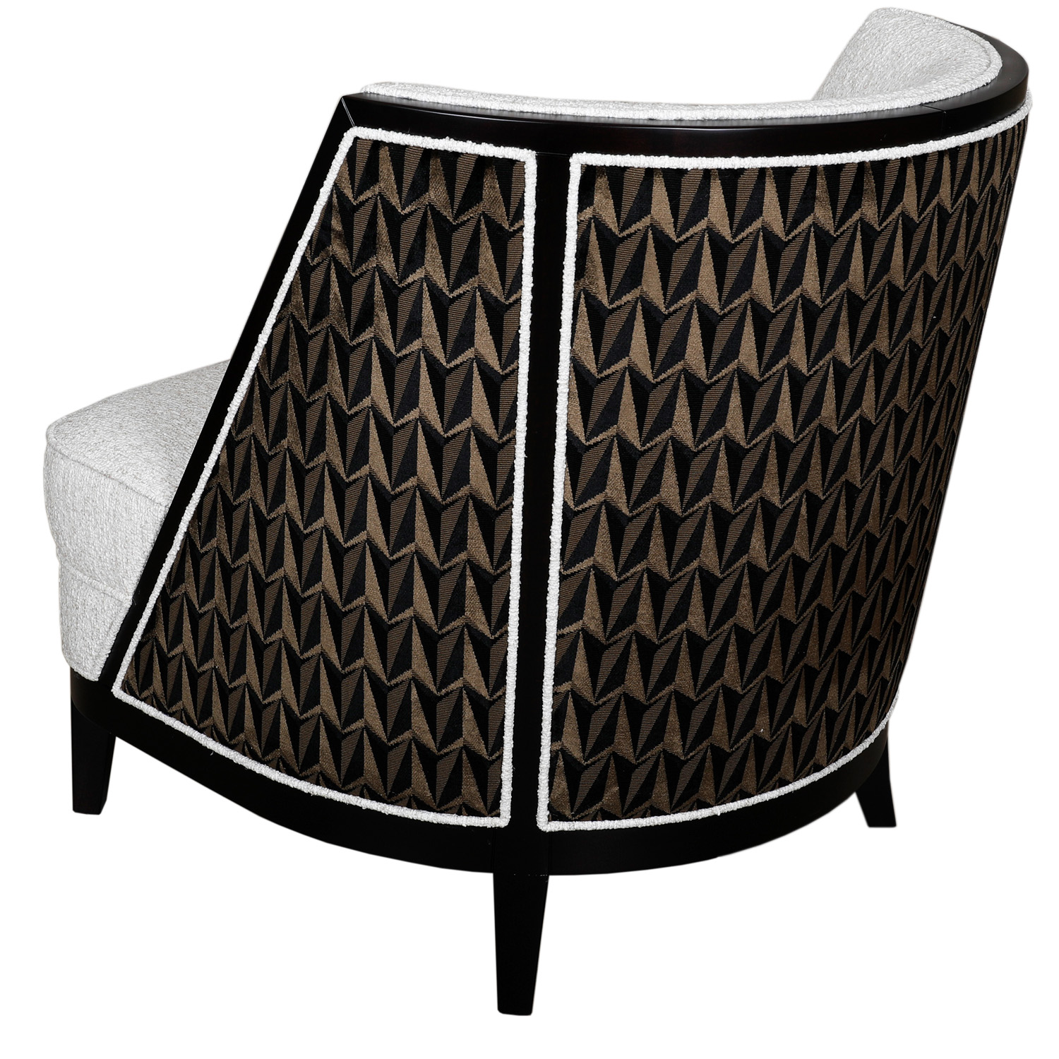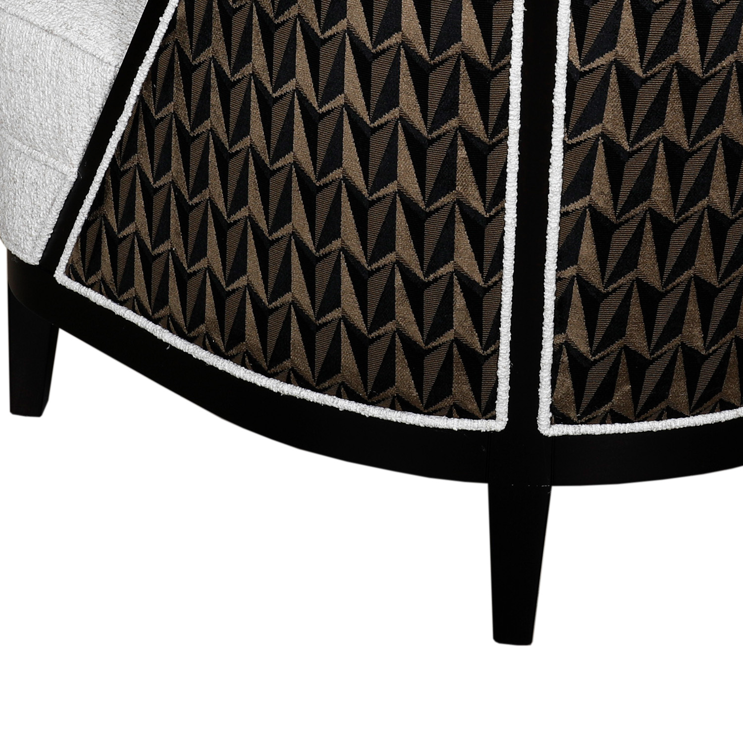 The Coss Armchair is available as per seen in x 2 quantity, in the stunning mixture of boucle-esque front fabric and geometric pattern contrast back. The piping detail against the black wood frame adds the dramatic yet enticing appeal to this Coss, completing the ultimate impeccable look with added comfort.