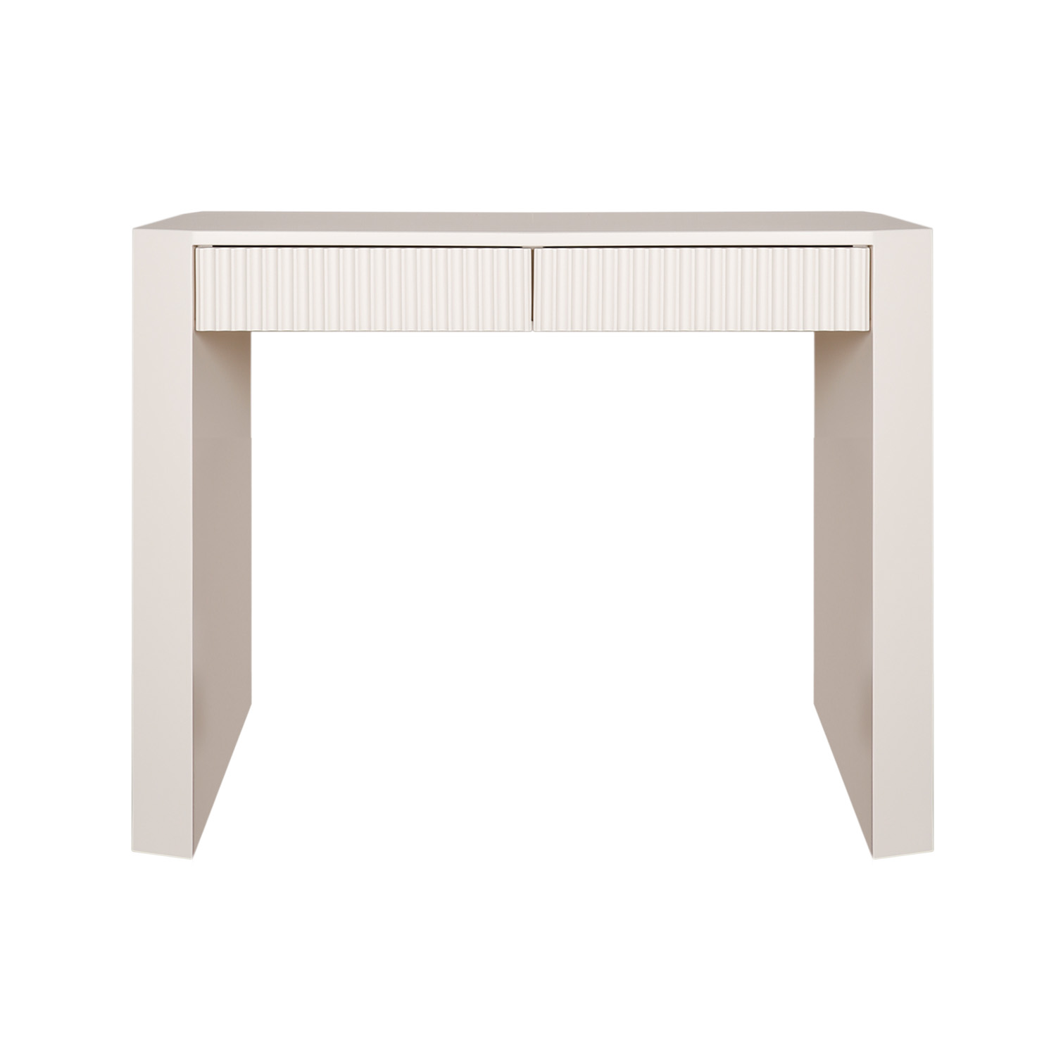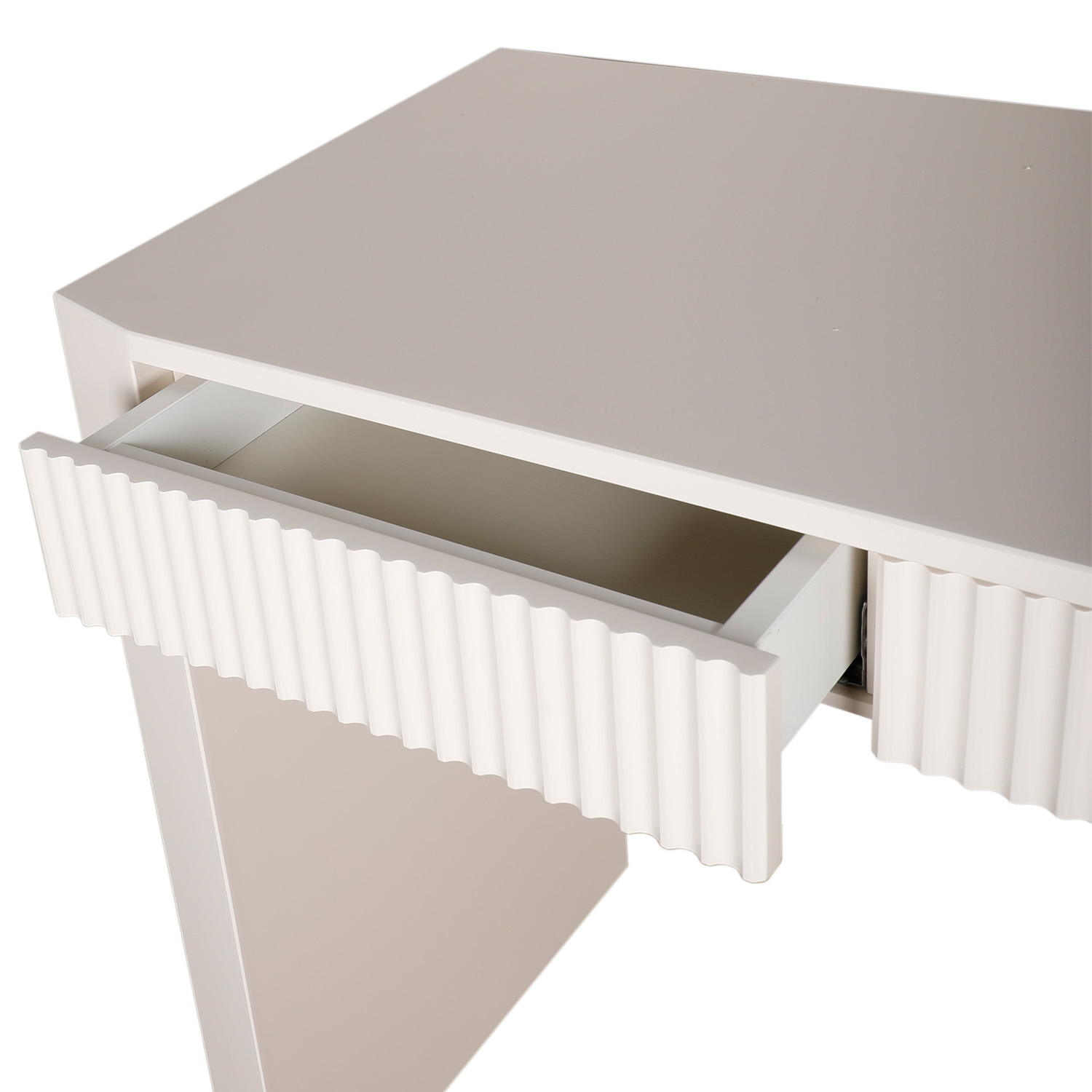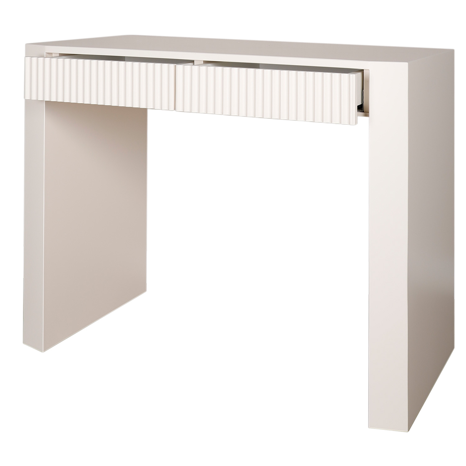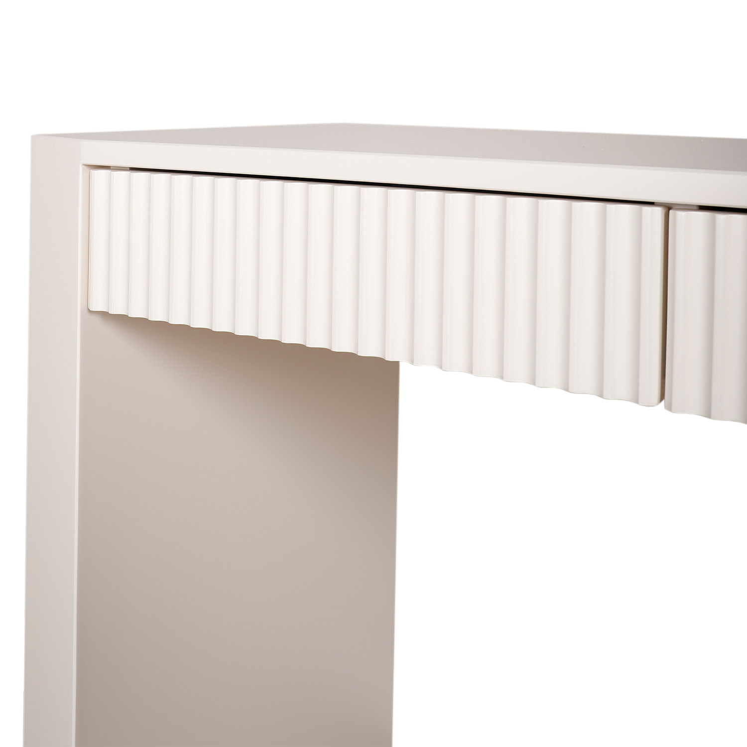 The Elmas console table exudes a simplistic, luxurious feel with its clean, modern design. It features two drawers with textured fluted fronts, combining practicality with style. Subtly angled legs add a refined, contemporary touch, enhancing its elegant yet functional aesthetic.