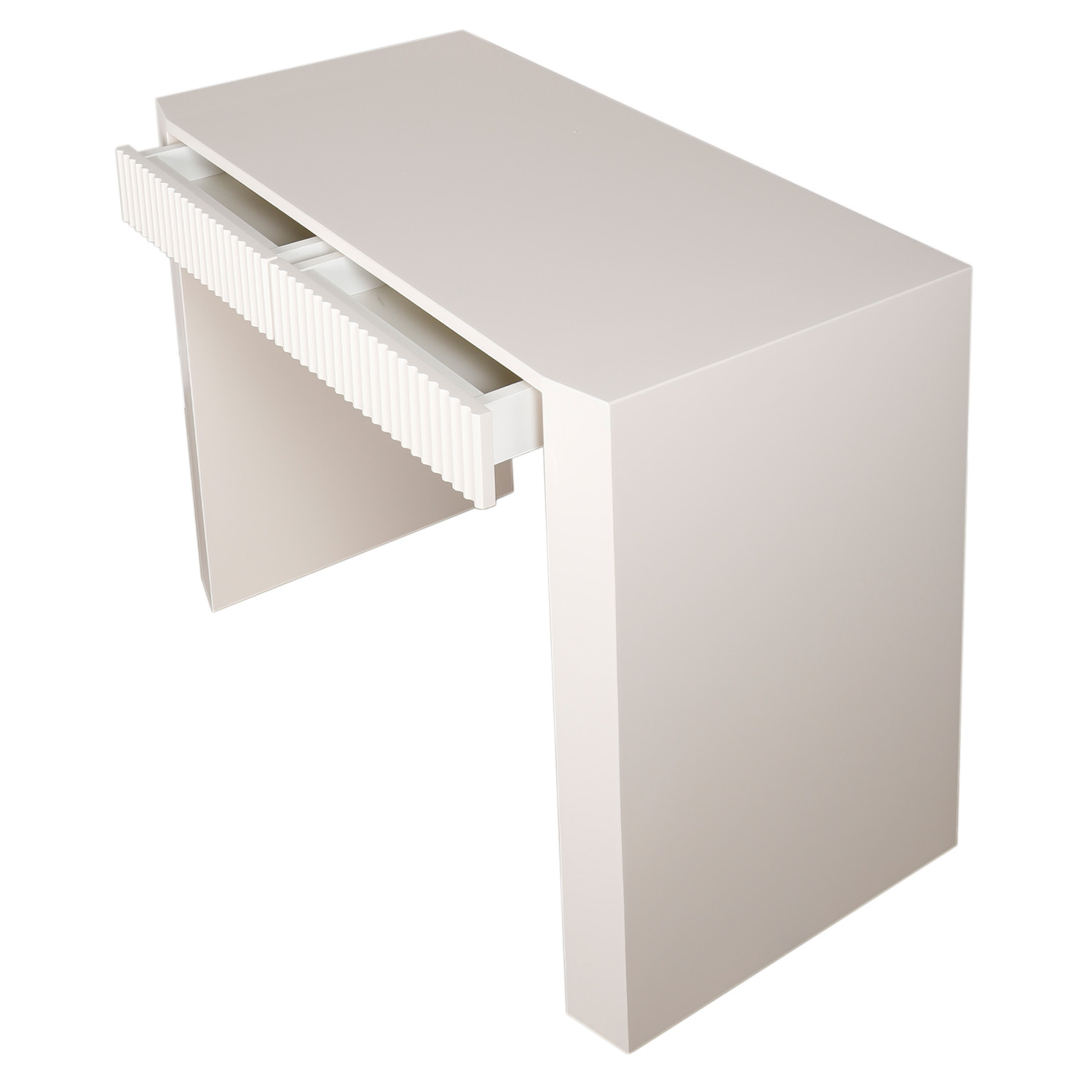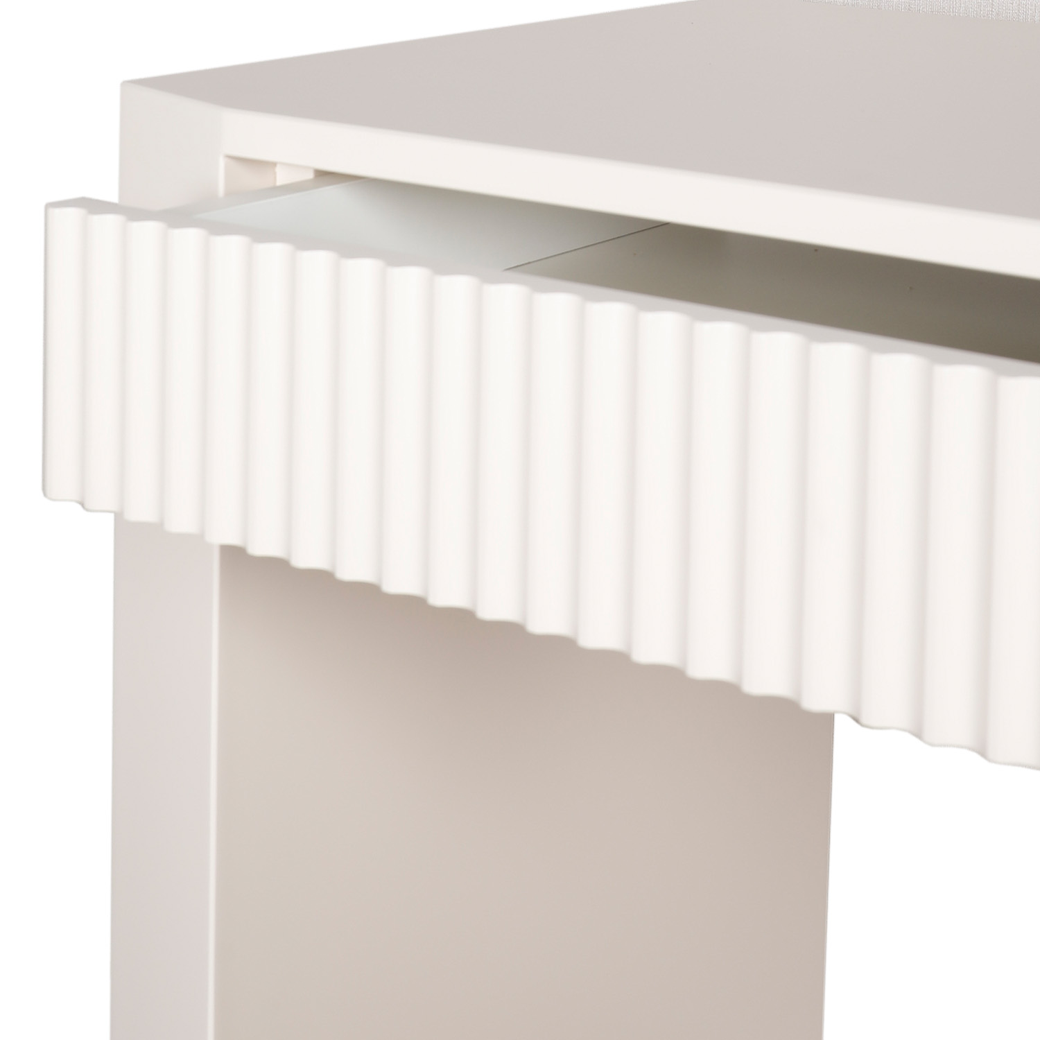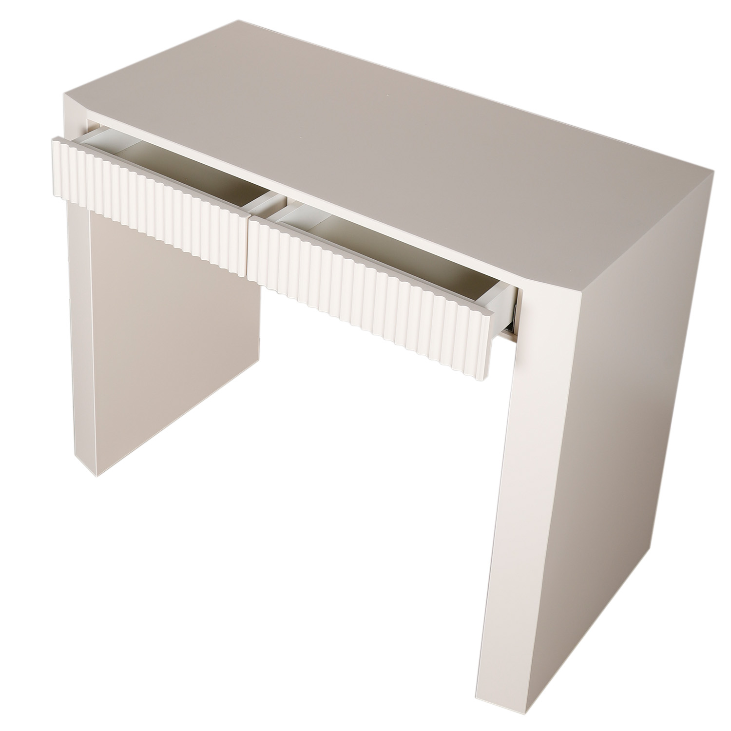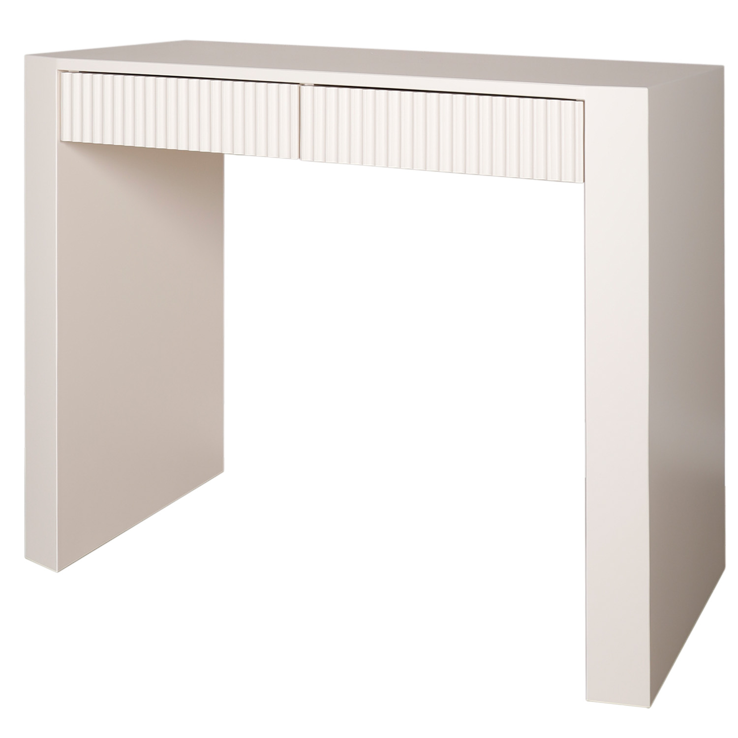 The Elmas console table exudes a simplistic, luxurious feel with its clean, modern design. It features two drawers with textured fluted fronts, combining practicality with style. Subtly angled legs add a refined, contemporary touch, enhancing its elegant yet functional aesthetic.