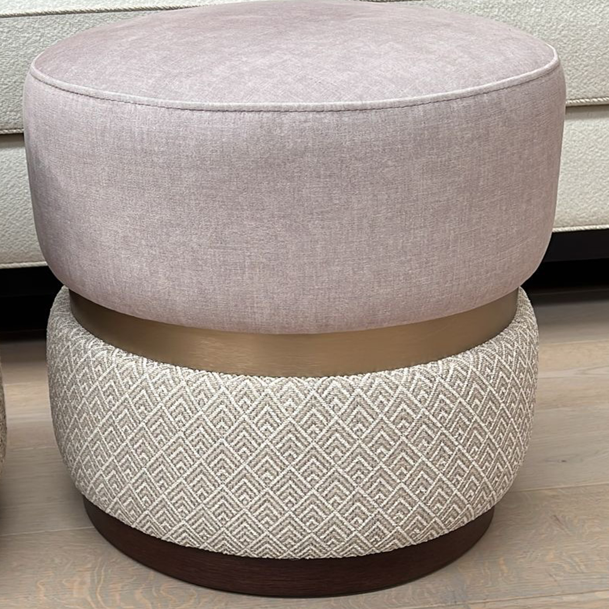 The Melis Cube is available in a set of two, as shown, showcasing a striking combination of materials. It features a mauve velvet top paired with a textured woven pattern base, creating depth and visual interest. The design is elegantly finished with brushed bronze trim and a wenge wood plinth, bringing together a thoughtfully curated mix of textures and tones for a truly sophisticated look.