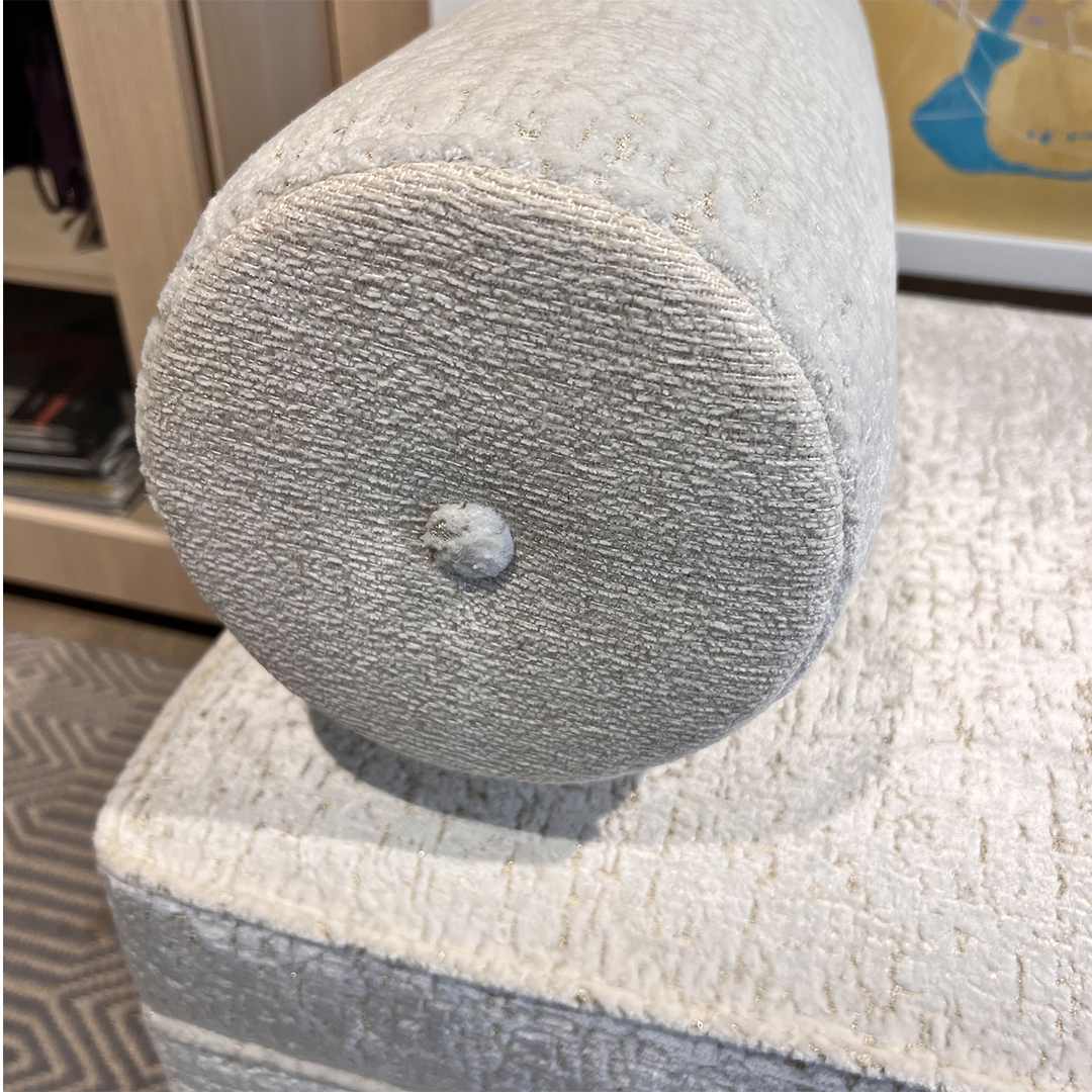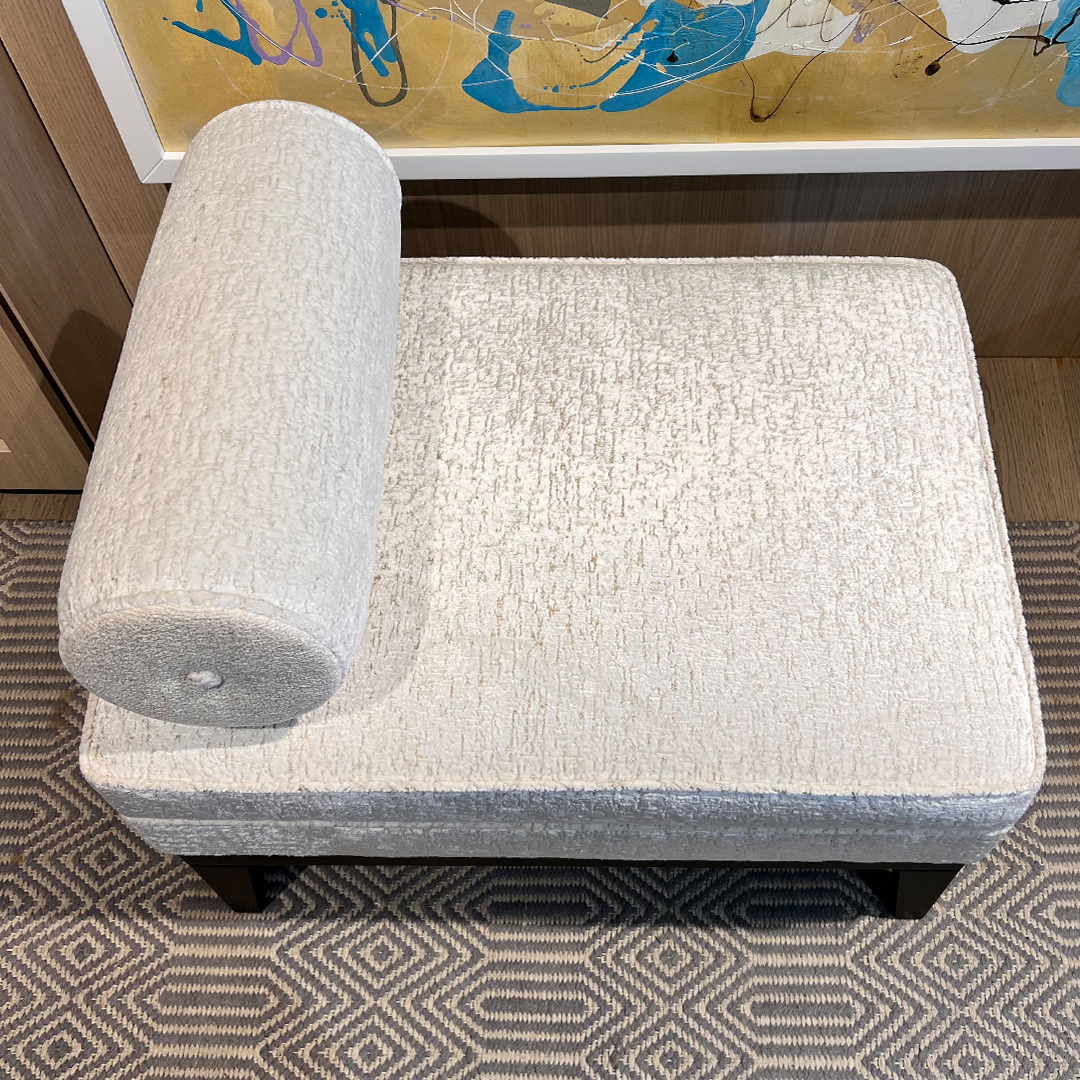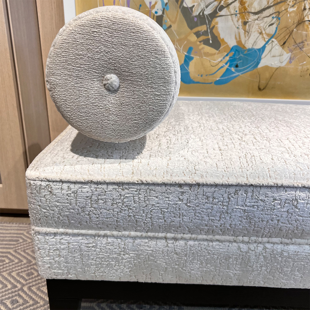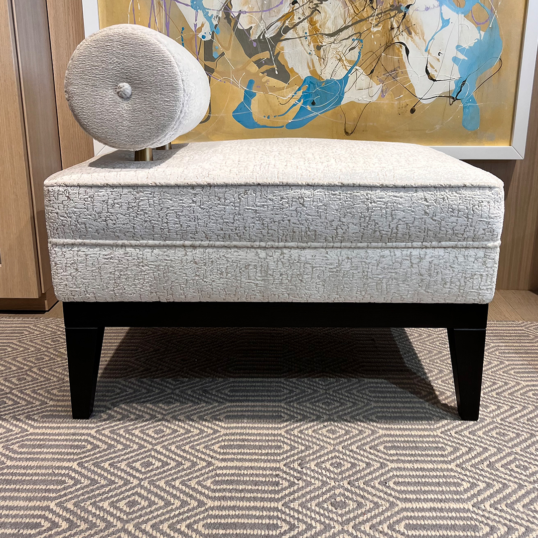 The kilis is available as per seen from second slide photo, in the stunning jacquard velvet fabric with contrast detail on the fixed bolster rest. The wood finish on the legs are black 20% sheen beechwood. The Kilis stool / bench is ready to entice any interior space!