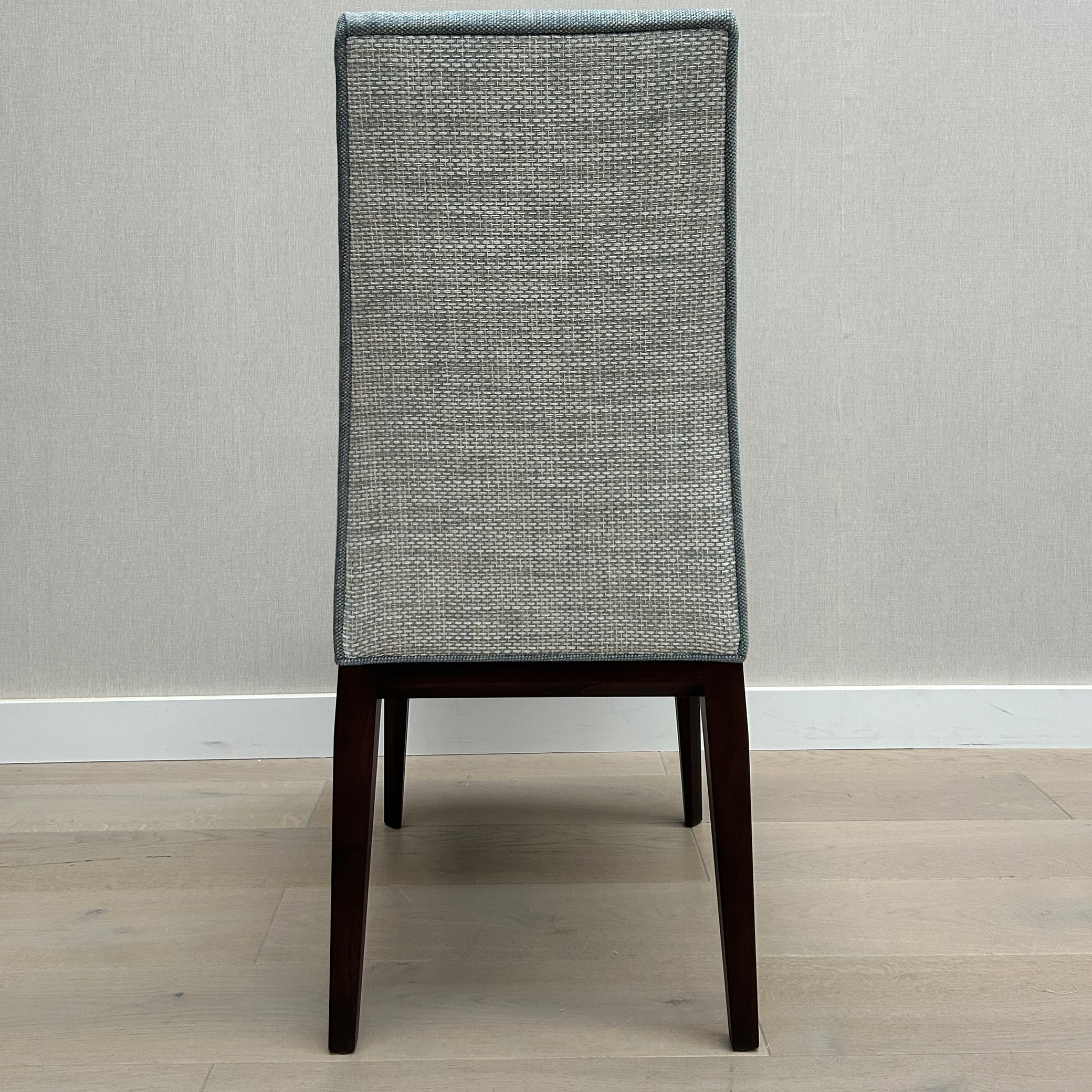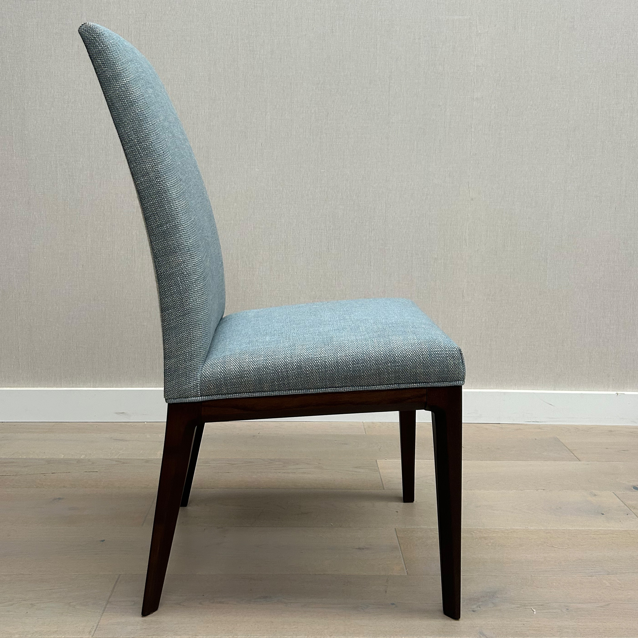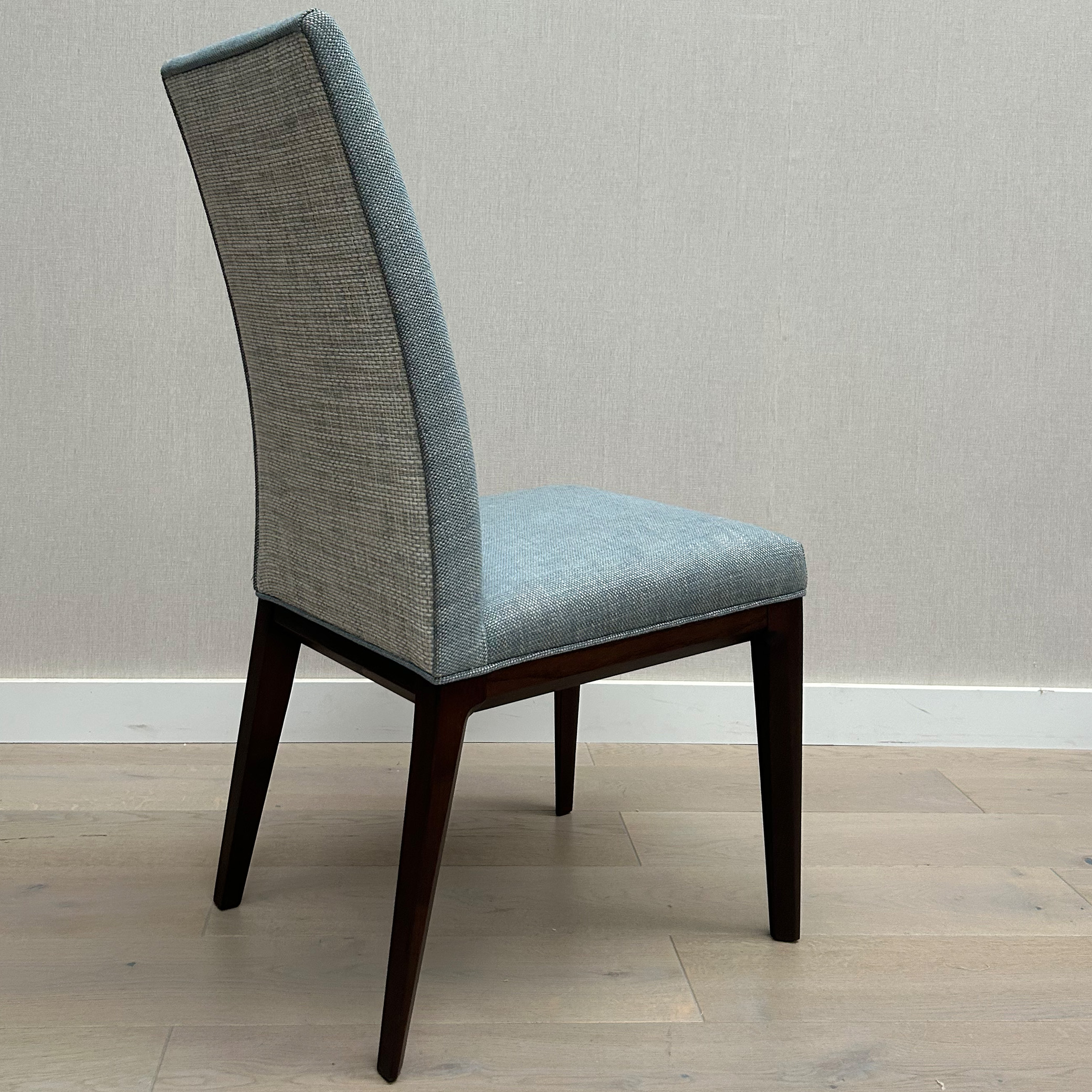 The Palma Dining Chair is available in x 6 quantity, as per seen in a lien mixture of blue front with grey contrast upholstery on back view – adding a dramatic mix! Ready to elevate your dining table, and embrace a comfortable fit with its high backrest. The legs of the Palma Dining Chairs are in Black Stained 20% sheen Beechwood.