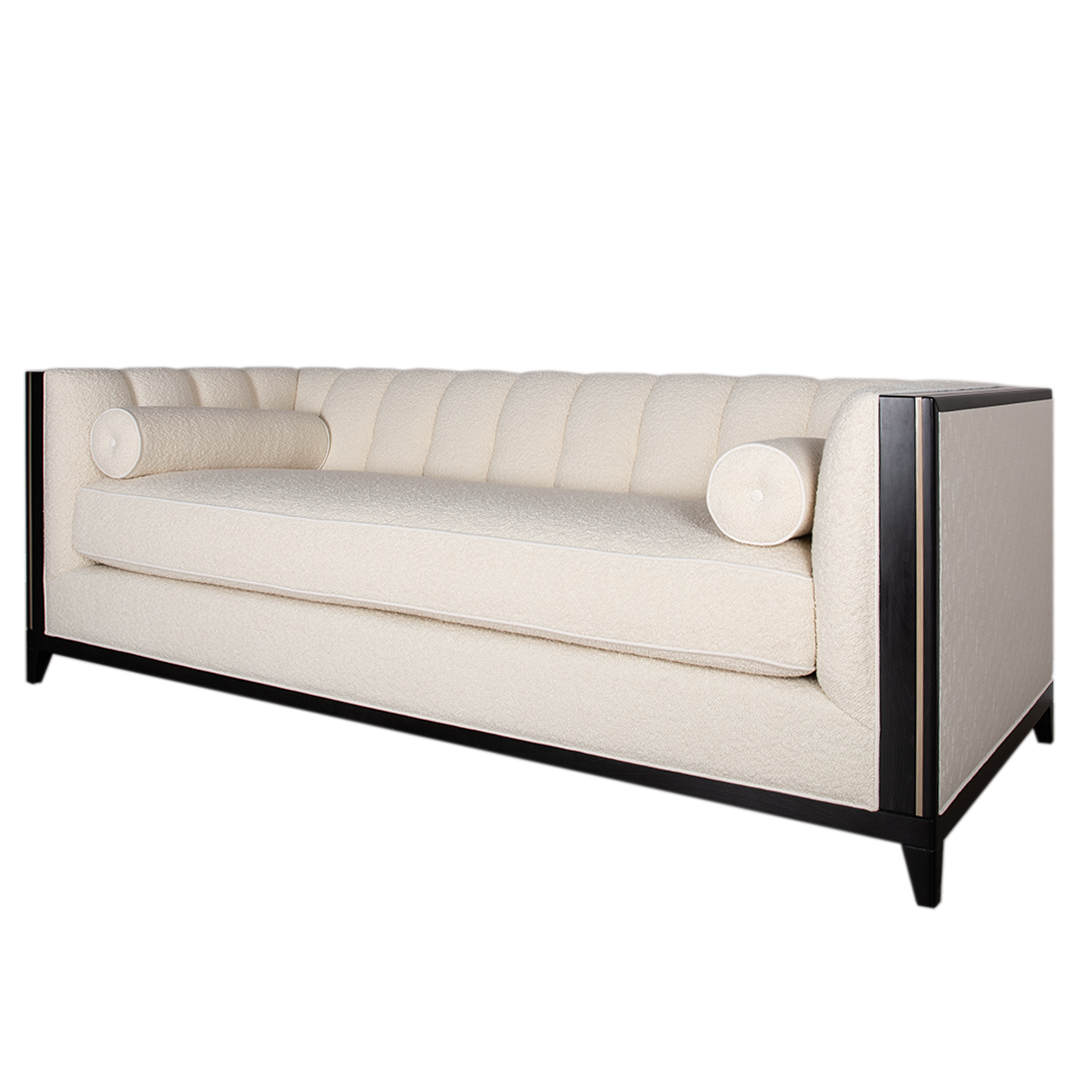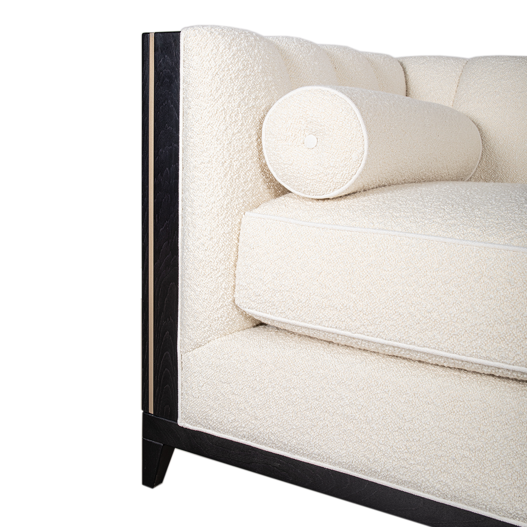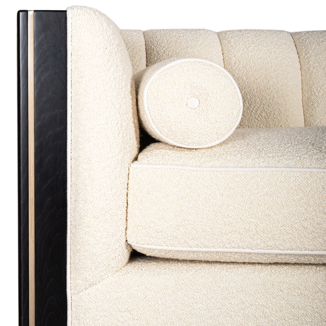 Zurich Luxe 3-Seater Sofa is available as per seen in x 1 quantity, in a captivating boucle front fabric contrast with stunning subtle pattern back. The frame compliments in its black stained 20% sheen carcass, contrasting this time in wood with the brushed bronze in-lay.