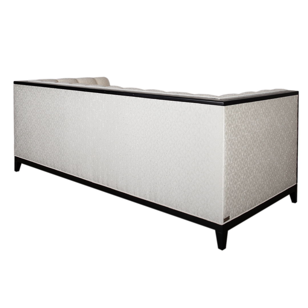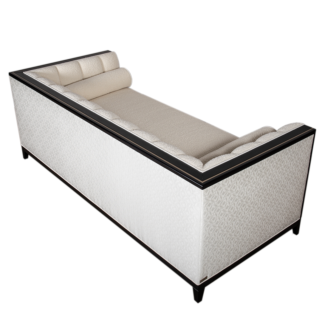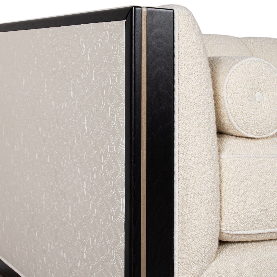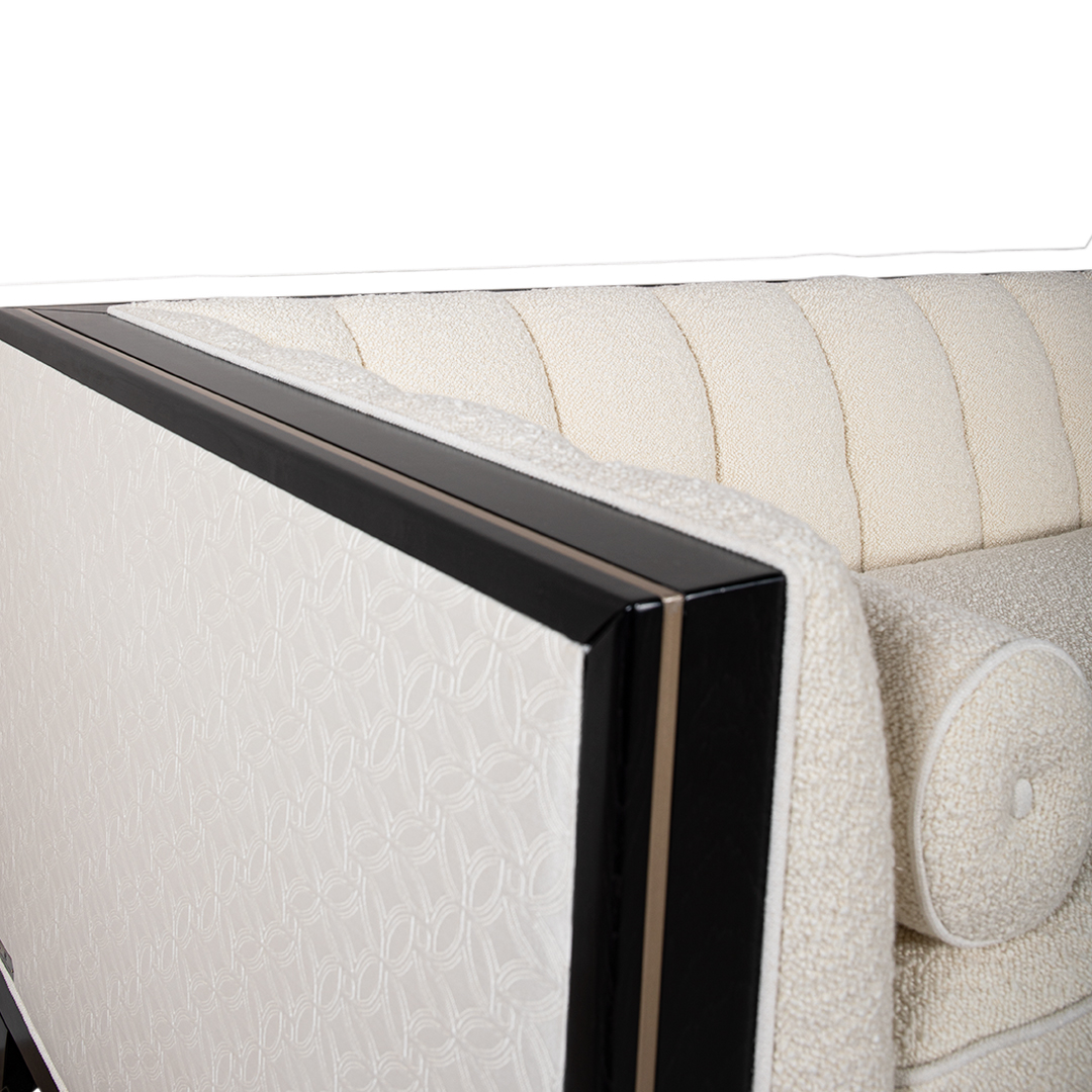 Zurich Luxe 3-Seater Sofa is available as per seen in x 1 quantity, in a captivating boucle front fabric contrast with stunning subtle pattern back. The frame compliments in its black stained 20% sheen carcass, contrasting this time in wood with the brushed bronze in-lay.